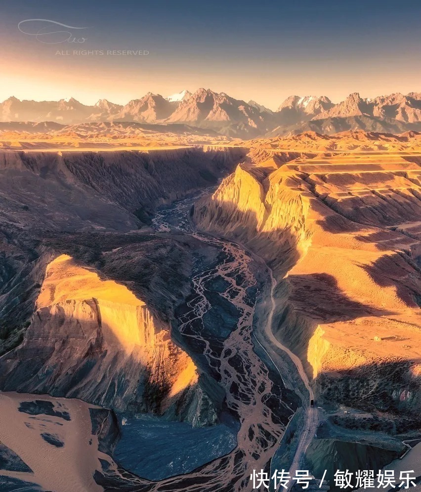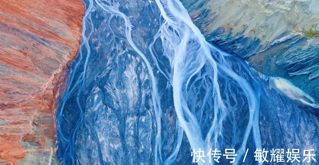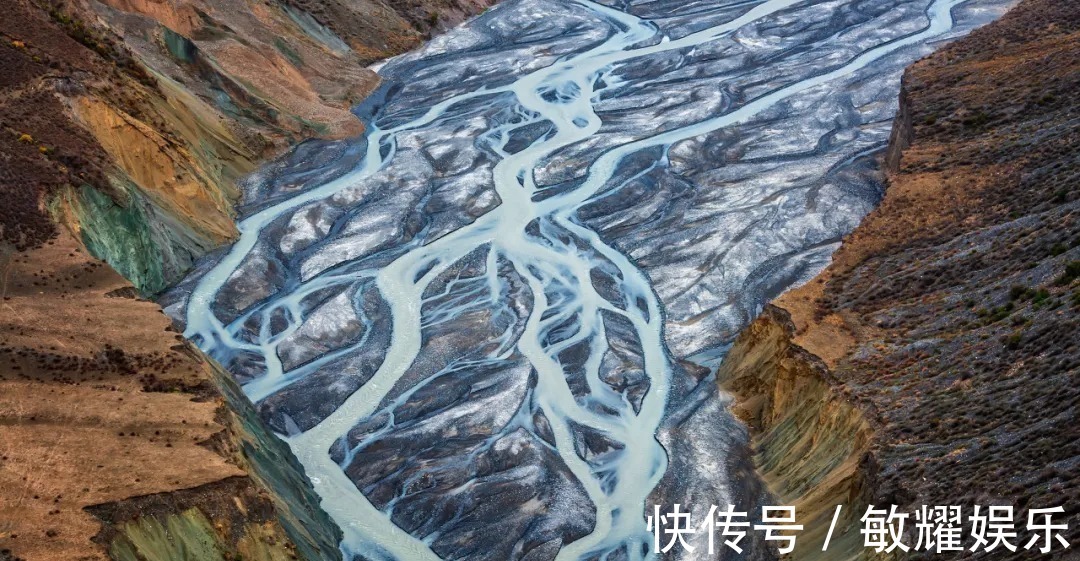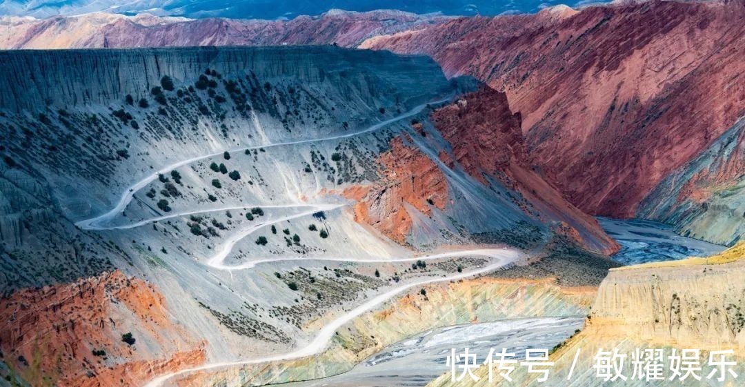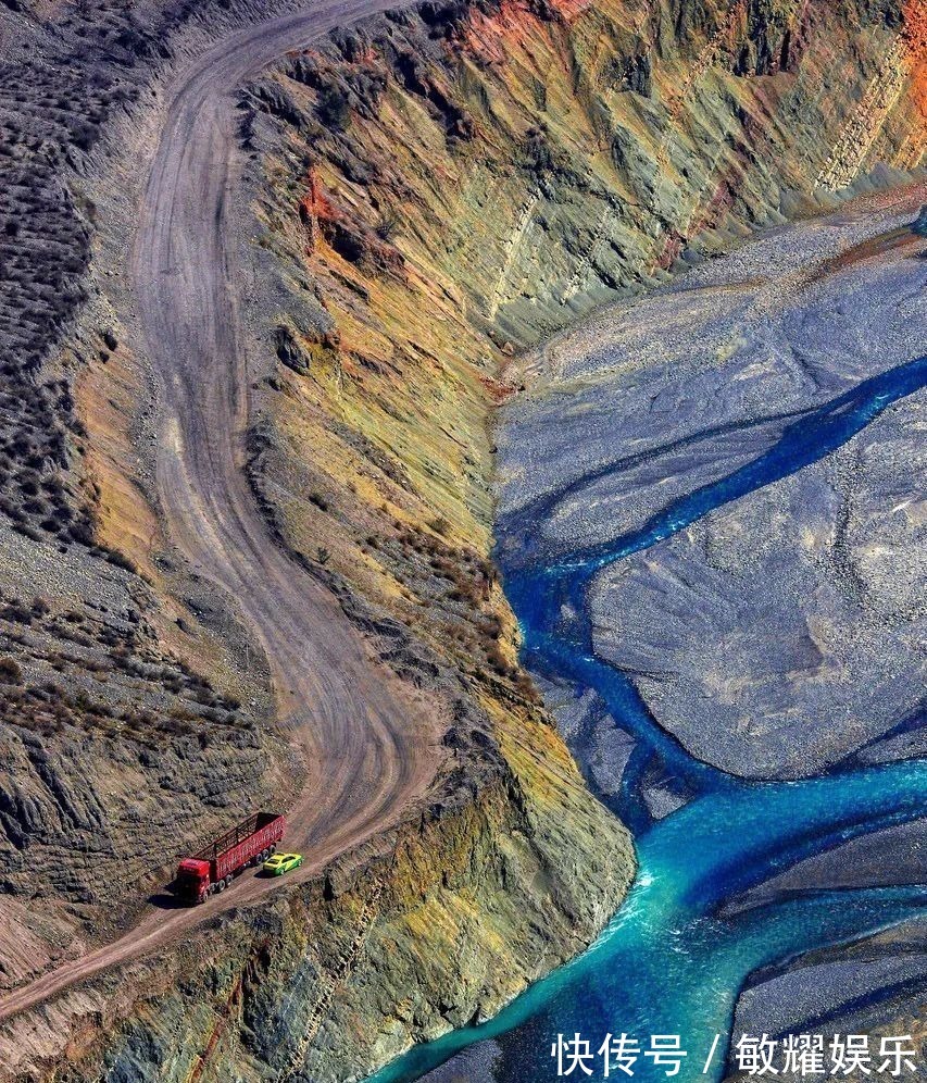 站高俯视,安集海峡谷不同于别的峡谷,色彩异常丰富,河流切割大地,将不同颜色的岩层冲刷溶解,成就了这幅就连艺术家也不敢这样创作的神作。